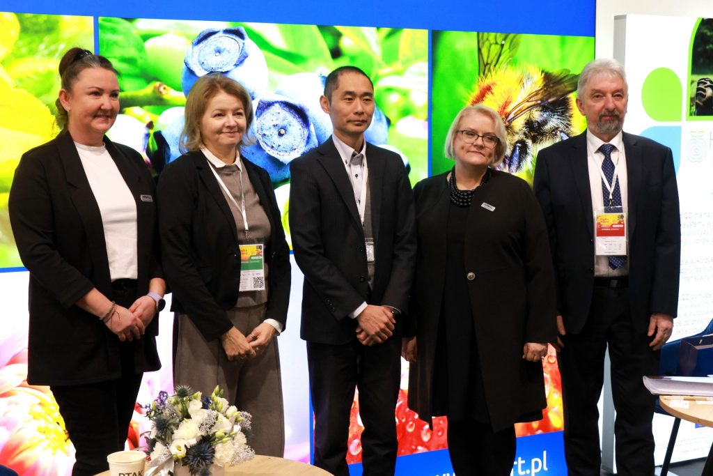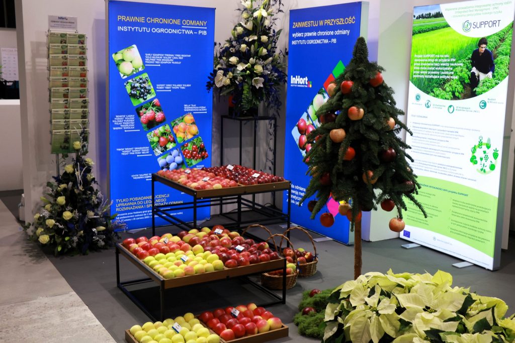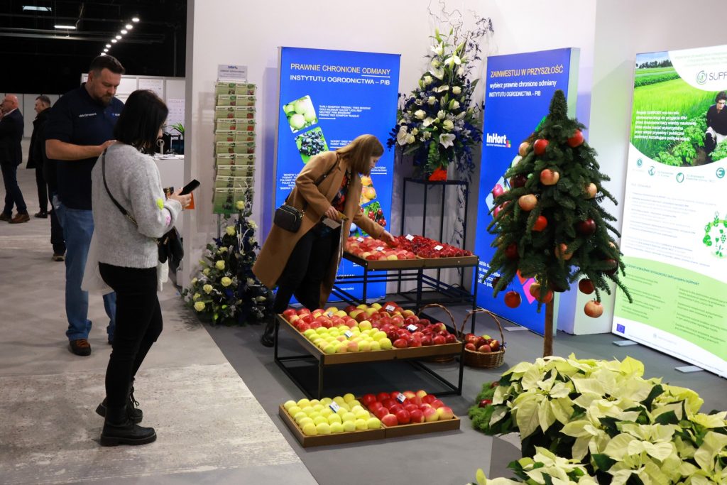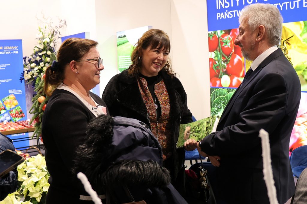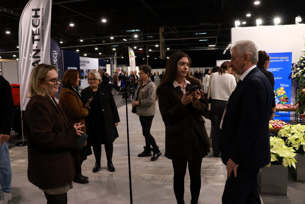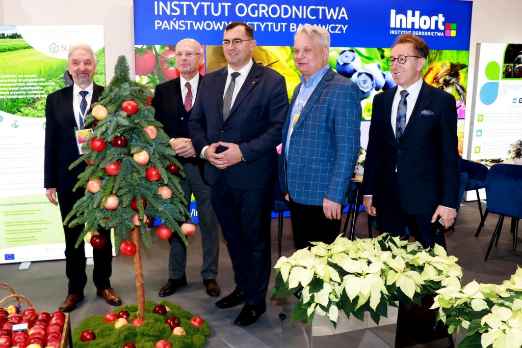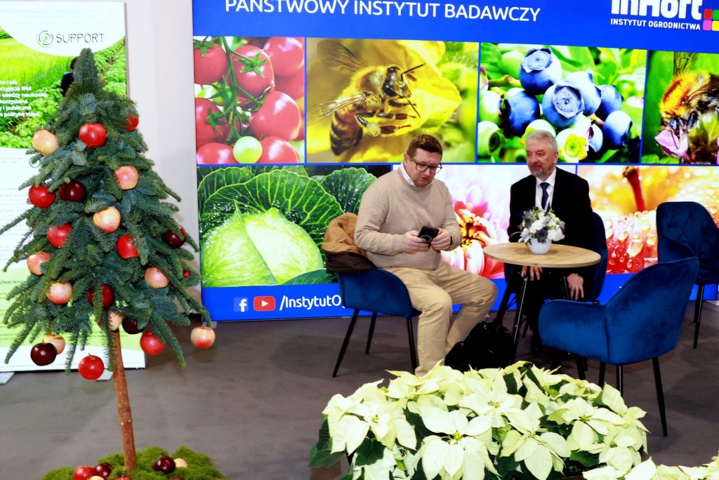 Instytut miał również swoje stoisko, na którym prezentowano owoce odmian hodowli IO-PIB oraz materiały pokazujące wyniki badań i projektów realizowanych w jednostce, a także publikacje powstałe w ramach zadań celowych finansowanych przez MRiRW. Stoisko, uatrakcyjnione aranżacjami kwiatowymi, przyciągało wielu odwiedzających, umożliwiając bezpośrednią rozmowę między naukowcami a praktykami. Wśród naszych gości był m.in Minister Rolnictwa i Rozwoju Wsi – Pan Stefan Krajewski, którego obecność podkreśliła rangę wydarzenia oraz znaczenie prezentowanej działalności naukowej. Obecny podczas targów dr inż. Krzysztof P. Rutkowski, Dyrektor Instytutu Ogrodnictwa – PIB, akcentował rolę współpracy nauki z praktyką sadowniczą oraz potrzebę wspólnego reagowania na wyzwania stojące przed branżą. Konferencja i Targi były doskonałą okazją do podsumowania sezonu 2025, wymiany doświadczeń oraz dyskusji o kierunkach rozwoju polskiego sadownictwa.